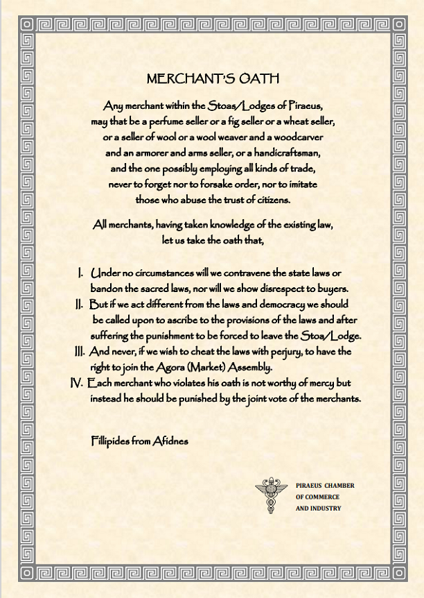 Ο Πρόεδρος Νικόλαος Μαυρίκος με την ιδιότητα του ως Υπεύθυνος Γ.Ε.Μ.Η. & Εξυπηρέτησης Επιχειρήσεων του Ε.Β.Ε.Π. παρέδωσε, στον Αντιπρόεδρο του Εμπορικού Επιμελητηρίου της Γένοβας Mr Alessandro Cavo στην CLIA INNOVATION EXPO 2024, πιστό αντίγραφο του όρκου των εμπόρων της Ιπποδάμιας Αγοράς του 4ου π.Χ. αιώνα ο οποίος βρέθηκε κατά την ανασκαφή ανέγερσης κτηρίου το 1970. Η παράδοση αυτού του αντιγράφου αποτελεί μια συμβολική πράξη για την ενίσχυση της συνεργασίας μεταξύ των εμπορικών επιχειρήσεων των δύο φορέων.