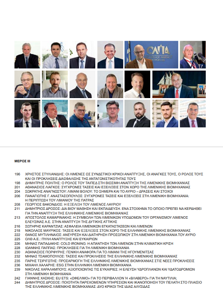 Τέλος στο τρίτο μέρος της έκδοσης φιλοξενούνται απόψεις σημαντικών στελεχών, ακαδημαϊκών, αξιωματούχων και θεσμικών φορέων που δραστηριοποιούνται τόσο στον χώρο της σύγχρονης ελληνικής λιμενικής βιομηχανίας όσο και στον ευρύτερο χώρο της παράκτιας οικονομίας.